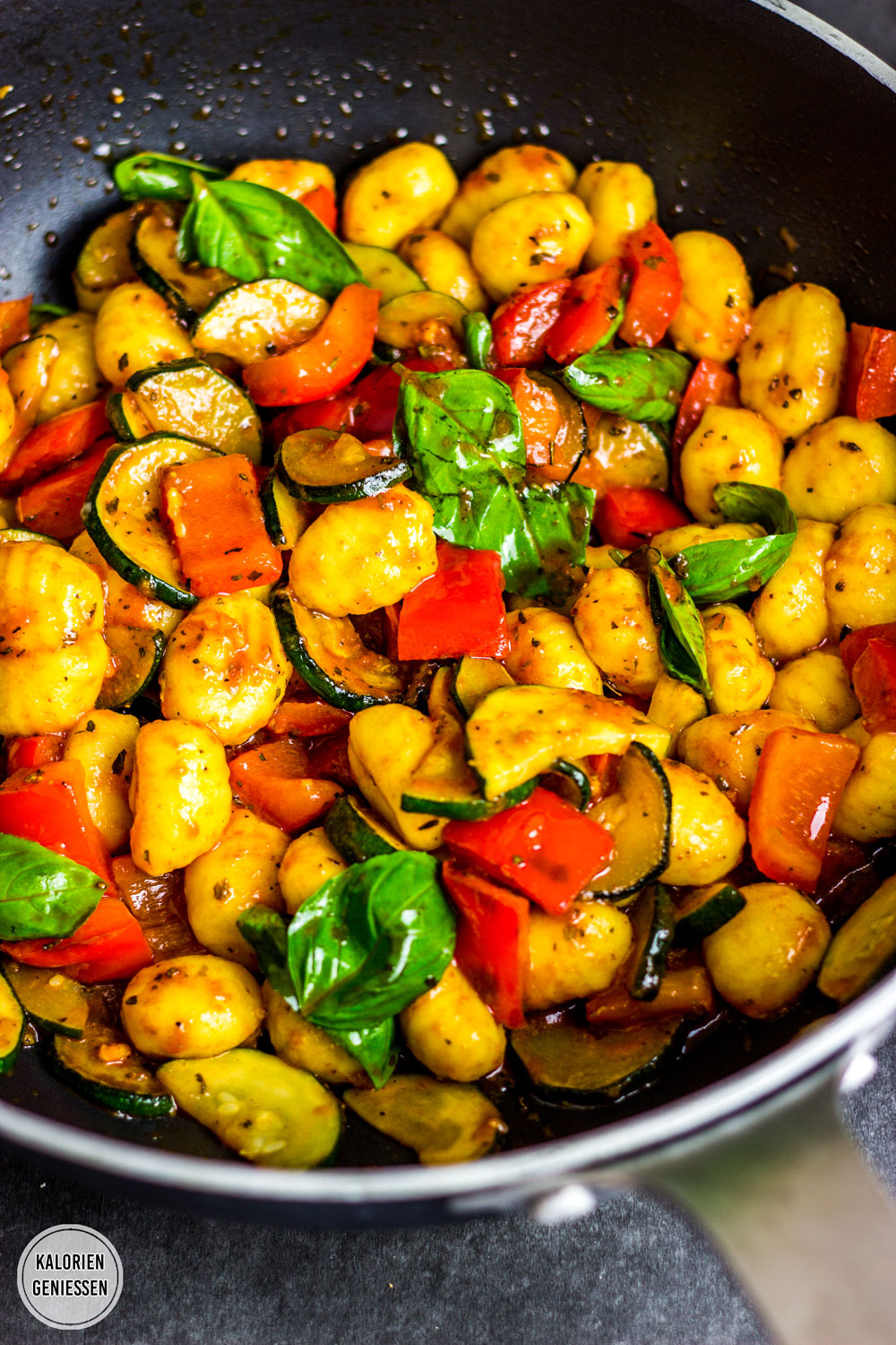 Meine Gnocchi aus dem Kühlregal enthalten auf 100 g 154 kcal – das passt bei uns beiden. Die großen „Übeltäter“ bei diesem Rezept sind das Olivenöl und die Gnocchi. Selbst wenn ich die Menge der Paprika (200 g) und Zucchini (400 g) erhöhe, komme ich „nur“ auf 520 kcal.